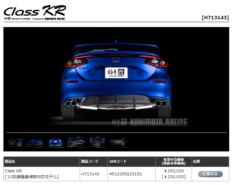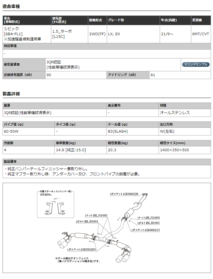 【 シビック 1.5L 2WD車 ターボ車 型式 6BA-FL1/5BA-FL1 エンジン L15C 年式 2021/9- グレード LX/EX 6MT車/CVT車 純正バンパーテールフィニッシャー取外 アンダーカバー等各所要分解 ≪ テール:83Φ 左右計4本出し ≫≪ H713143 ≫】 柿本改マフラー 【 ClassKRマフラー 】